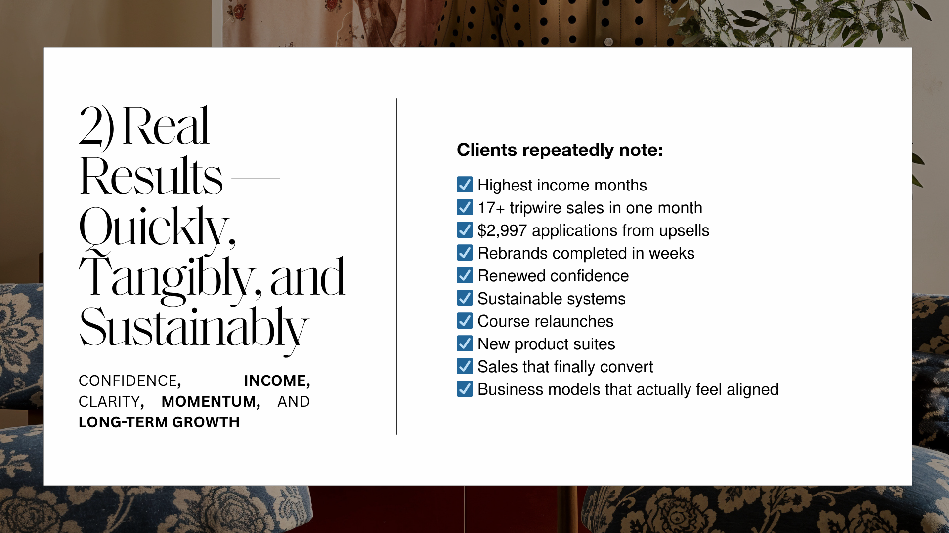 ✦ Six and multi–six-figure entrepreneurs who have outgrown their old systems, offers, and delivery model and are ready to rebuild a business that runs with them, not against them